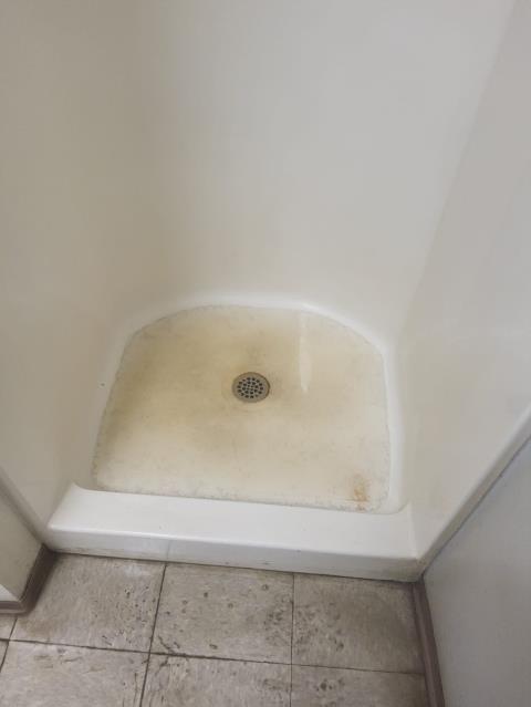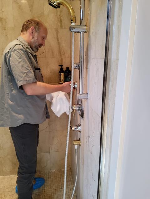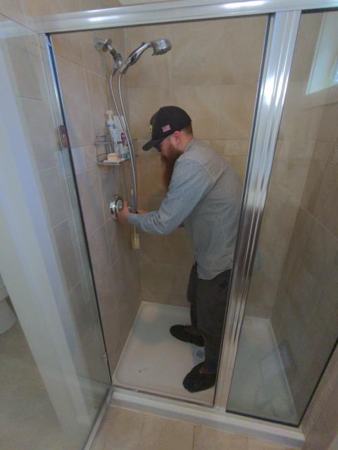 Working on a clogged shower drain.
