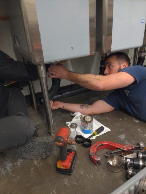 The customer needs a new sink, hand-washing station, and mop sink installed. They also need hot water service, so a water heater will need to be installed. A dedicated circuit for electrical will need to be run to power the unit. There is no water being delivered to the building, so a new water line will need to be run from the meter into the building to supply the fixtures. The sewer line is located on the outside wall with clean-out access available for tie-in.